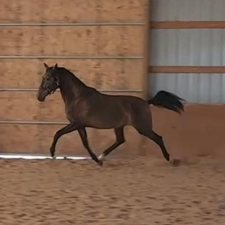 Born April 2023, this black APSL filly is the bomb. She is the daughter of Raposodia, sired by Halconero. Thalia looks brown but this is winter coat which is about to shed, and she is actually black. New photos coming next month. This is a proven cross which results in friendly dispositions, excellent brains and like her half siblings, she has been endowed with tons of athleticism. Her black sire Preto (16.1H) is by the imported APSL stallion Damasco. Her dam Raposodia is imported from Portugal and is an outstanding producer. She has inherited the wind beneath her feet and will be a dream to work with. Located in UTAH.